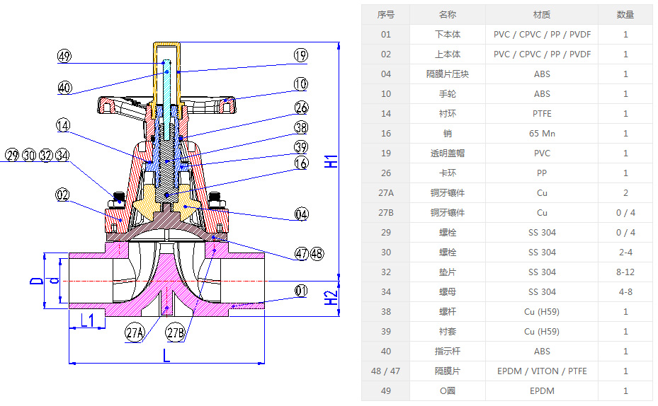 1) 材質(zhì):UPVC,CPVC,PPH,Clear PVC,PVDF